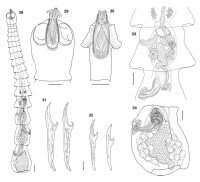 Figs. 28–34 Paraprogynotaenia canarisi n. sp. from Charadrius marginatus in South Africa. 28. Entire individual, dorsal view. 29. Scolex with protracted rostellum, optical section. 30. Scolex with ret... MoreFigs. 28–34 Paraprogynotaenia canarisi n. sp. from Charadrius marginatus in South Africa. 28. Entire individual, dorsal view. 29. Scolex with protracted rostellum, optical section. 30. Scolex with retracted rostellum (laterally), optical section. 31. Rostellar hooks from a semicircle. 32. Lateral rostellar hooks. Scale-bars: 28, 200 µm; 29,30, 100 µm; 31,32, 10 µm. Fig. 33. Female proglottis, dorsal view. 34. Male proglottis, dorsal view. Scale-bars: 33-34, 100µm. |