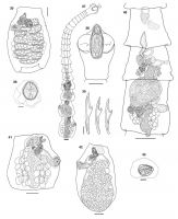 Fig. 35-36 Paraprogynotaenia canarisi n. sp. from Charadrius marginatus in South Africa. 35. Gravid proglottis, dorsal view. Scale-bars: 36, 10 µm. Figs. 37–40 Paraprogynotaenia canarisi n. sp. from C... MoreFig. 35-36 Paraprogynotaenia canarisi n. sp. from Charadrius marginatus in South Africa. 35. Gravid proglottis, dorsal view. Scale-bars: 36, 10 µm. Figs. 37–40 Paraprogynotaenia canarisi n. sp. from Charadrius alexandrinus in Taiwan. 37. Entire individual, dorsal view. 38. Scolex with retracted rostellum, optical section. 39. Lateral rostellar hooks. 40. Pre-mature, female and post-mature proglottides, dorsal view. Scale-bars: 37,38,40, 100 µm; 39, 10 µm. Figs. 41–43 Paraprogynotaenia canarisi n. sp. from Charadrius alexandrinus in Taiwan. 41. Male proglottis, dorsal view. 42. Gravid proglottis, dorsal view. 43. Egg. Scale-bars: 41,42, 100 µm; 43, 10 µm |