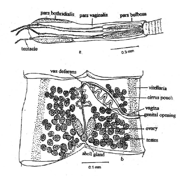 Fig. 1. Callitetrarhynchus blochii n.sp., Camera lucida drawing; a- Scolex, b-mature proglottid
