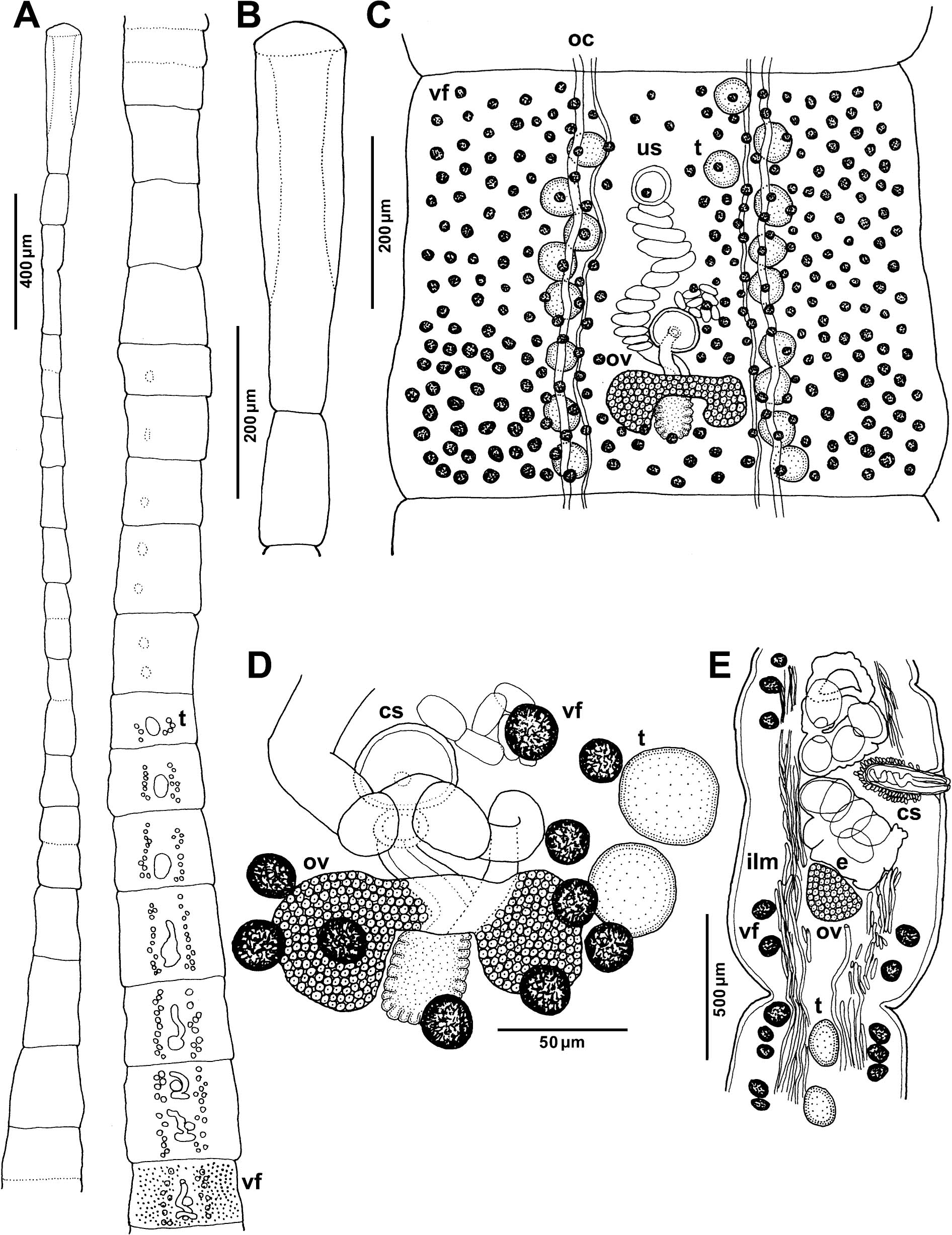 lateral view; C, diagrammatic drawing of a mature segment; D, detail of a mature segment; E, sagittal section of gravid segments at the level of the cirrus-sac. Abbreviations: cs,
