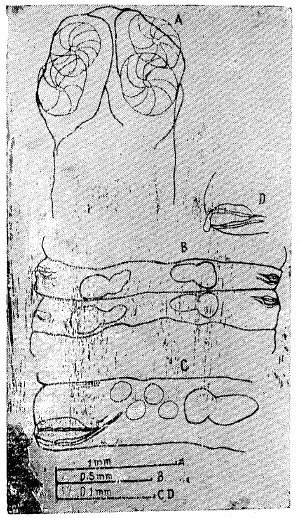 Aliezia aurangabadensis n. sp. A. Scoles B. Mature segment C. Mature segment one side. D. Genital tubes.