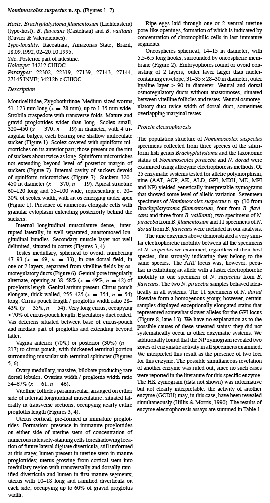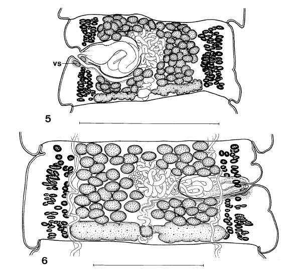 Figures 5–6. Nomimoscolex suspectus n. sp. 5. Mature proglottis, dorsal view, from syntype material of N. piraeeba Woodland (1934, plate 10, figure 7), BMNH 1964.12.15.111-122. Abbreviations: vs, vagi... MoreFigures 5–6. Nomimoscolex suspectus n. sp. 5. Mature proglottis, dorsal view, from syntype material of N. piraeeba Woodland (1934, plate 10, figure 7), BMNH 1964.12.15.111-122. Abbreviations: vs, vaginal sphincter. 6. Nomimoscolex suspectus n. sp. Holotype, 34212 CHIOC, dorsal view, mature proglottis. Scale-bar: 500 µm. |