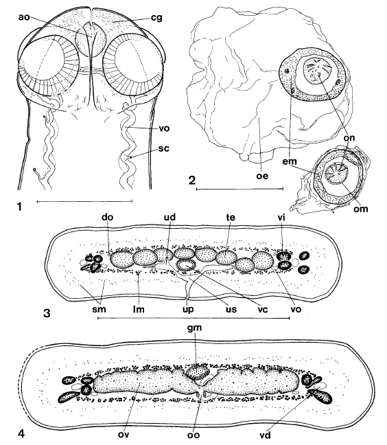 Figures 1–4. Nomimoscolex suspectus n. sp. 1. Scolex, ventral view, holotype, 34212 CHIOC. 2. Nomimoscolex suspectus n. sp. Eggs drawn in distilled water, paratype, 22302 INVE. 3. Nomimoscolex suspect... MoreFigures 1–4. Nomimoscolex suspectus n. sp. 1. Scolex, ventral view, holotype, 34212 CHIOC. 2. Nomimoscolex suspectus n. sp. Eggs drawn in distilled water, paratype, 22302 INVE. 3. Nomimoscolex suspectus n. sp. Transverse section of posterior part, mature proglottis, paratype, 27139 INVE. 4. Nomimoscolex suspectus n. sp. Transverse section at ovarian level, mature proglottis, paratype, 27139 INVE. Abbreviations: ao, apical organ; cg, glandular cells; do, dorsal osmoregulatory canal; em, embryophore; gm, Mehlis’ gland; lm, internal longitudinal musculature; oe, outer envelope; om, oncospheric membrane; on, oncosphere; oo, oöcapt; ov, ovary; sc, secondary canals; sm, secondary musculature; te, testes; ud, uterine diverticula; up, uterine pore; us, uterine stem; vc, vaginal canal; vd, vitelloduct; vi, vitelline follicles; vo, ventral osmoregulatory