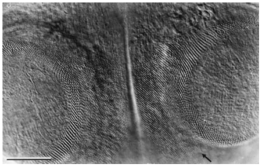Figure 7. Nomimoscolex suspectus n. sp. Photomicrograph of scolex. Detail of suckers showing the numerous spiniform microtriches on their rim and the smaller spiniform microtriches present on the scol... MoreFigure 7. Nomimoscolex suspectus n. sp. Photomicrograph of scolex. Detail of suckers showing the numerous spiniform microtriches on their rim and the smaller spiniform microtriches present on the scolex. The spiniform microtriches end at the level of the posterior margin of the sucker (arrow). Holotype 34212 CHIOC. Scale-bar: 50 µm. |