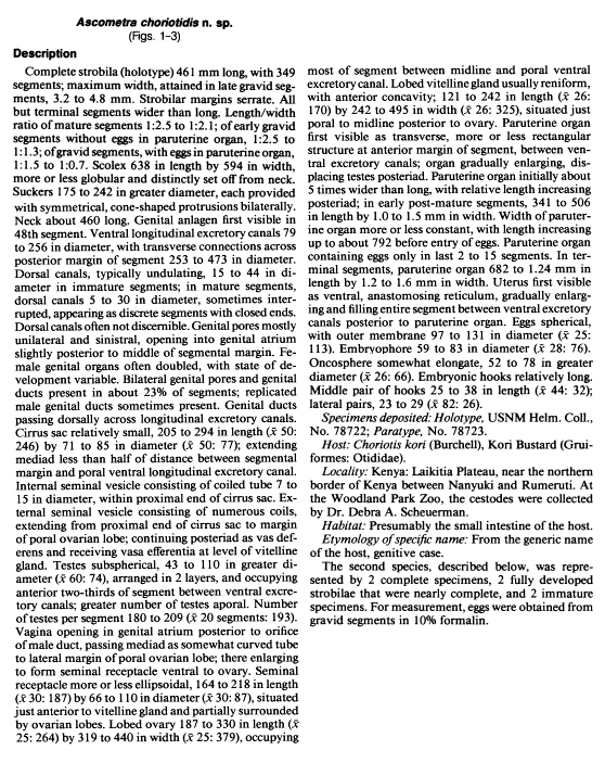 | Total Number of Type Specimens | 1 complete cestode, 1 taht lacked only the scolex and early immature segments, and the posterior half of a third. |