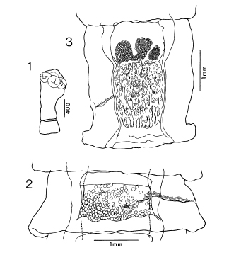 FIGURES 1-3. Ascometra choriotidis n. sp. 1. Scolex. 2. Mature segment, ventral view. 3. Terminal gravid segment, dorsal view.