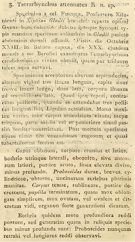 Rudolphi, C. A. 1819. Entozoorum synopsis, cui accedunt mantissa duplex et indices locupletissimi. Sumtibus Augusti Rücker, Berolini (Berlin), 811 pp. (14) Download PDFMonticelli, F. S. 1893. Intorno ad alcuni elminti della collezione del Museo Zoologico della Reale Università di Palmero. Naturalista Siciliano 12: 167-180, 208-216. (326) Download PDF |