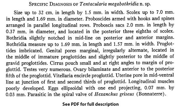 Hart, J. F. 1936. Cestodes from fishes of Puget Sound - II. Tetrarhynchoidea. Transactions of the American Microscopical Society 55: 369-387. (4349) Download PDFSchmidt, G. D. 1986. Handbook of tapeworm identification. CRC Press, Boca Raton, Florida, 675 pp. (660) Download PDF |