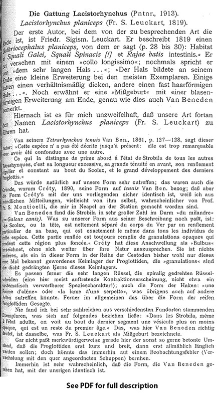 Leuckart, F. S. 1819. Zoologische Bruchstücke. 1. J. R. G. Leuckart, Helmstädt, 70 pp. (566) Download PDFPintner, T. 1930. Wenigbekanntes und Unbekanntes von Rüsselbandwürmern. Anzeiger der Akademie der Wissenschaften in Wien. Mathematische-naturwissenchaftliche Klasse 67(15): 148. (7044) Download PDF |