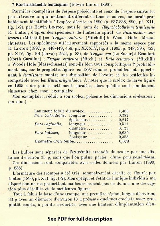 Linton, E. 1890. Notes on Entozoa of marine fishes of New England, with descriptions of several new species. Part II. United States Commision of Fish and Fisheries. Part XV. Report of the Commissioner for 1887 15: 718-899. (1011) Download PDFDollfus, R.-P. 1946. Notes diverses sur les Tetrarhynques. Memoires du Museum national d’Histoire naturelle 22: 179-220. (4268) Download PDF |