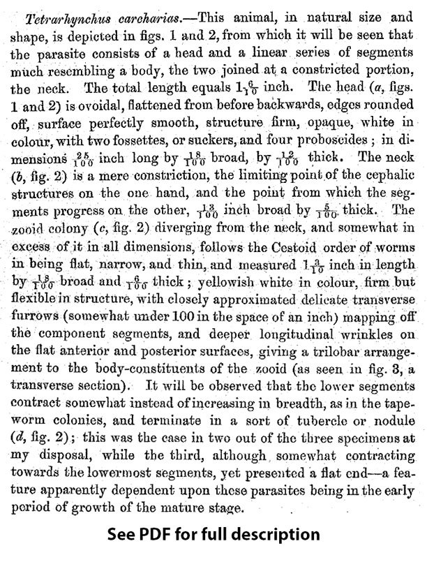 Welch, F. H. 1876. The Anatomy of Two Parasitic Forms of the Family Tetrarhynchidae. Journal of the Linnean Society of London, Zoology 12: 329-337. (4427) Download PDF |