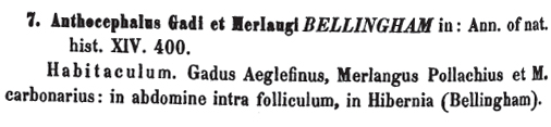 Bellingham, O. 1844. Catalog of Irish Entozoa, with observations. Magazine of Natural History 13: 101-104.