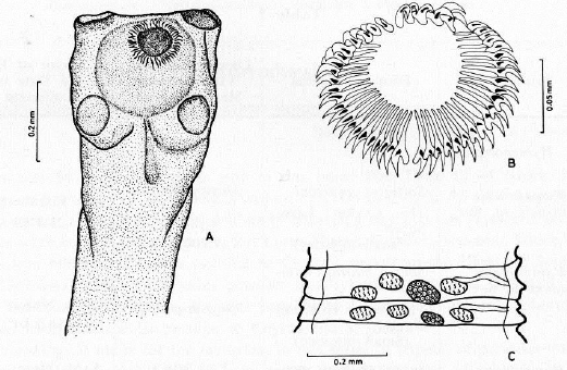Fig. 1. — Vampirolepis solisoricis sp. nov. A: Anterior end. B: Crown of rostellar hooks. C: Mature proglottids.