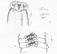 Fig. 2. — Vampirolepis montana sp. nov. A: Anterior end. B: Rostellar hooks. C: Mature proglottids.