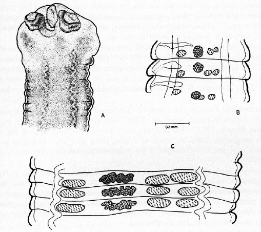 Fig. 3. — Hymenolepis sunci sp. nov. A: Anterior end. B: Anterior maturing proglottids. C: Mature proglottids.