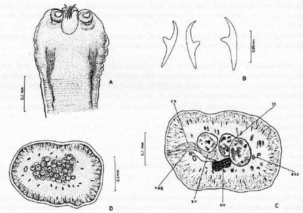 Fig. 4. — Pseudhymenolepis eisenbergi sp. nov. A: Anterior end. B: Rostellar hooks. C: T.S. mature proglottid. D: T.S. gravid proglottid. tt - testes, ov - ovary, sv - seminal vesicle, cs - cirrus sac, vag - vagina, exc - excretory canals.