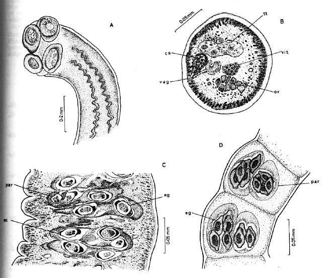 Fig. 5. — Cylindrotaenia philauti sp. nov. A: Anterior end. B: Mature proglottid (transverse section). C: Early proglottids (horizontal section). D: Late gravid proglottids (whole mount). tt - testis, vit - vitellaria, ov - ovary, vag - vagina, cs - cirrus sac, par - paruterine organ, ec - egg-capsule, eg - egg.