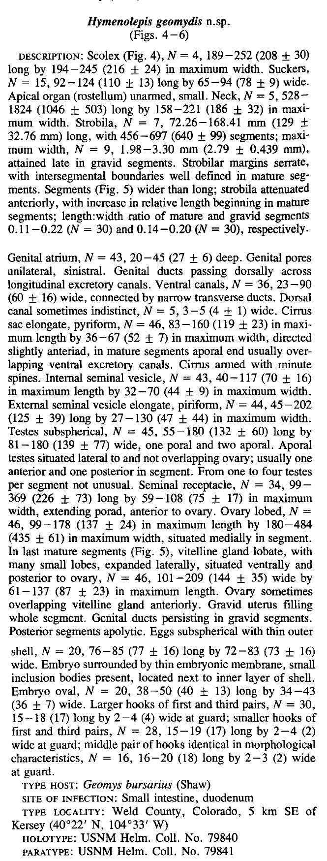 Gardner S. L. and G. D. Schmidt. 1988. Cestodes of the genus Hymenolepis Weinland, 1858 sensu stricto from pocket gophers Geomys and Thomomys spp. (Rodentia: Geomyidae) in Colorado and Oregon, with a discriminant analysis of four species of Hymenolepis. : 896-901. (4813) Download PDF |