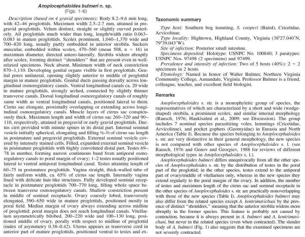 Haukisalmi, V. and R. P. Eckerlin. 2009. A new anoplocephalid cestode from the southern bog lemming Synaptomys cooperi. Journal of Parasitology 95: 690-694. (4587) Download PDF |