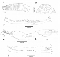 FIGURES 1–6. Anoplocephaloides bulmeri n. sp. from Synaptomys cooperi. (1) Strobila. (2) Scolex and anterior strobila. (3) Mature proglottid.