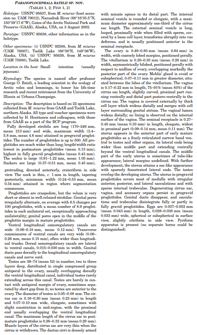 Haukisalmi, V., H. Henttonen, and L. M. Hardman. 2006. Taxonomy and diversity of Paranoplocephala spp. (Cestoda: Anoplocephalidae) in voles and lemmings of Beringia, with a description of three new species. Biological Journal of the Linnean Society 89: 277-299. (4590) Download PDF |