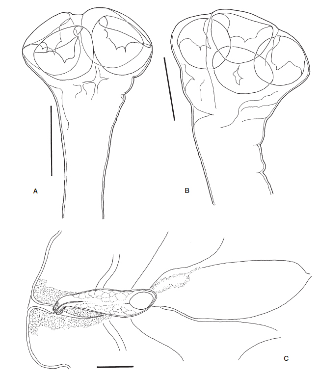 Figure 2. Paranoplocephala batzlii sp. nov. from Microtus miurus, Alaska. A, B, scolex (scale bars = 0.5 mm). C, terminal genital ducts (scale bar = 0.10 mm).