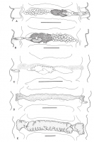 Figure 1. Paranoplocephala batzlii sp. nov. from Microtus miurus, Alaska. A, B, mature proglottides. C, early uterus in mature proglottis (testes not shown). D, uterus in postmature proglottis (testes not shown). E, fully developed uterus in pregravid proglottis. Scale bars = 0.50 mm.