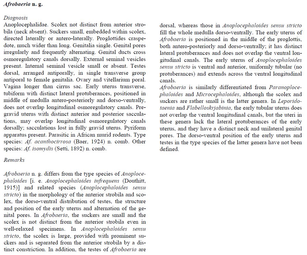 Baer, J.G. 1924. Contribution à la Faune helminthologique sud-africaine. Note préliminaire. Annales de Parasitologie humaine et comparée 2: 239-247. (4615) Download PDFHaukisalmi, V. 2008. Review of Anoplocephaloides species from African rodents, with the proposal of Afrobaeria n. g. (Cestoda: Anoplocephalidae). Helminthologia 45: 57-63. (4589) Download PDF |