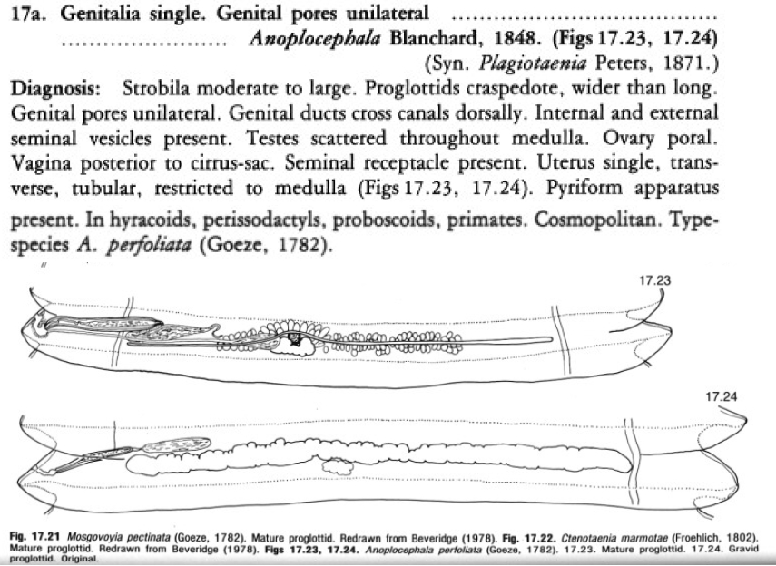 Beveridge, I. 1994. Family Anoplocephalidae Cholodkovsky, 1902. Keys to the Cestode Parasites of Vertebrates. : 315-366.