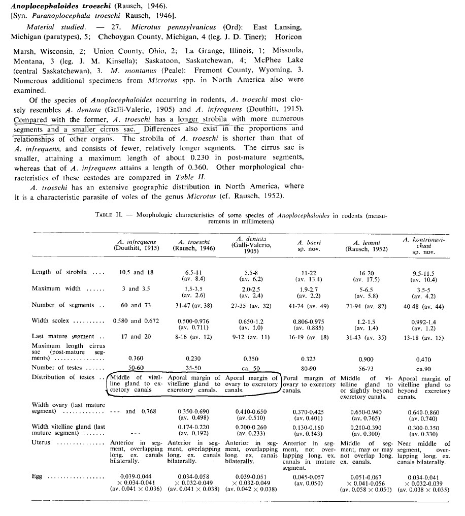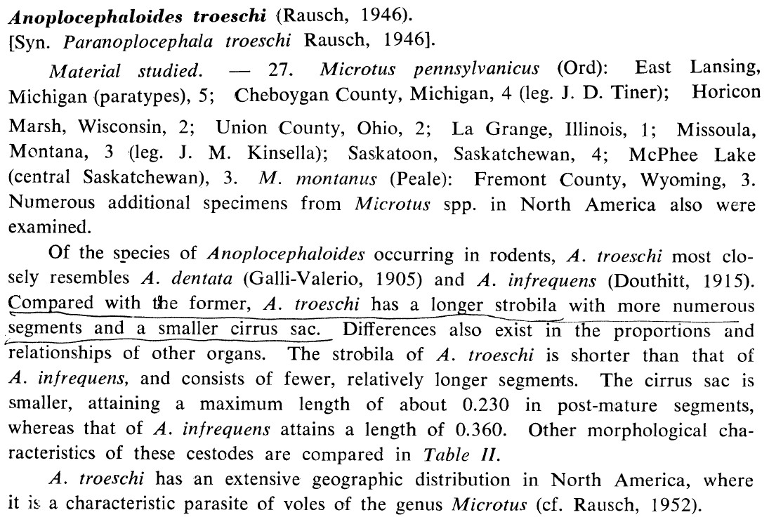 Rausch, R. 1946. Paranoplocephala troeschi, new species of cestode from the meadow vole, Microtus p. pennsylvanicus Ord. Transactions of the American Microscopical Society 65: 354-356.
