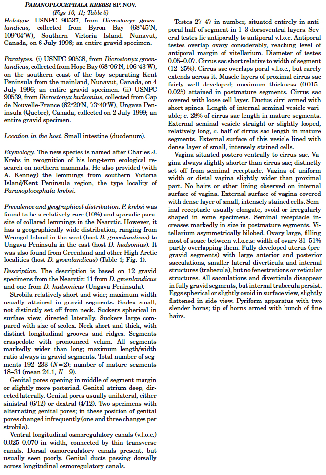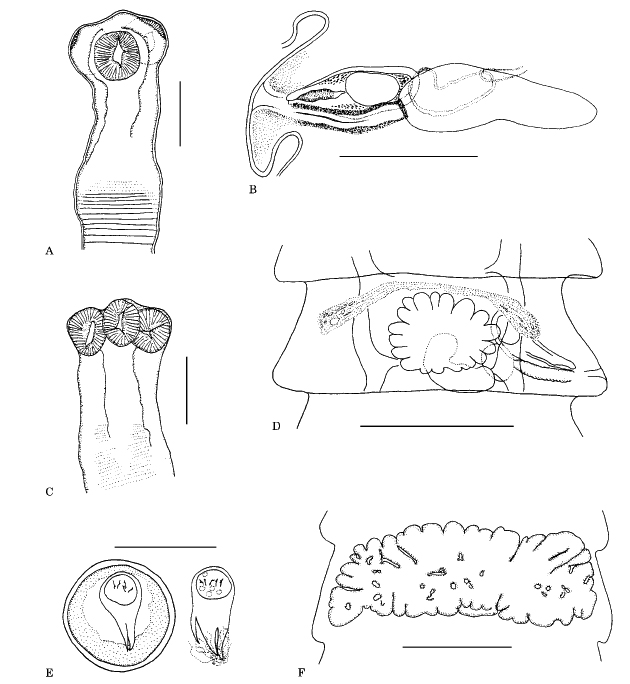 Figure 10. Paranoplocephala krebsi sp. nov. A, scolex. Byron Bay, host Dicrostonyx groenlandicus (scale bar=0.20 mm). B, genital ducts. Hope Bay, host D. groenlandicus (scale bar=0.20 mm). C, scolex. ... MoreFigure 10. Paranoplocephala krebsi sp. nov. A, scolex. Byron Bay, host Dicrostonyx groenlandicus (scale bar=0.20 mm). B, genital ducts. Hope Bay, host D. groenlandicus (scale bar=0.20 mm). C, scolex. Wrangel Island, host D. groenlandicus (scale bar=0.20 mm). D, early uterus in mature segment. Banks Island, host D. groenlandicus (scale bar=0.30 mm). E, egg and oncosphere with pyriform apparatus. Ungava Peninsula, host D. hudsonius (scale bar=0.040 mm). F, uterus in pregravid segment. Banks Island, host D. groenlandicus (scale bar=0.50 mm). |