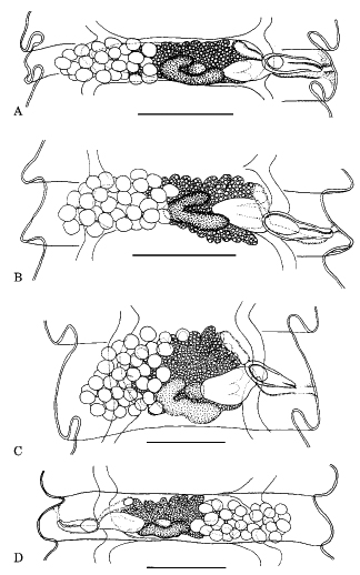 Figure 11. Paranoplocephala krebsi sp. nov.: mature segments. A, Byron Bay, host Dicrostonyx groenlandicus(scale bar=0.30 mm). B, Ungava Peninsula, host D. hudsonius (scale bar=0.30 mm). C, Wrangel Is... MoreFigure 11. Paranoplocephala krebsi sp. nov.: mature segments. A, Byron Bay, host Dicrostonyx groenlandicus(scale bar=0.30 mm). B, Ungava Peninsula, host D. hudsonius (scale bar=0.30 mm). C, Wrangel Island, host D.groenlandicus (scale bar=0.30 mm). D, Greenland, hostD. groenlandicus (scale bar=0.30 mm). |