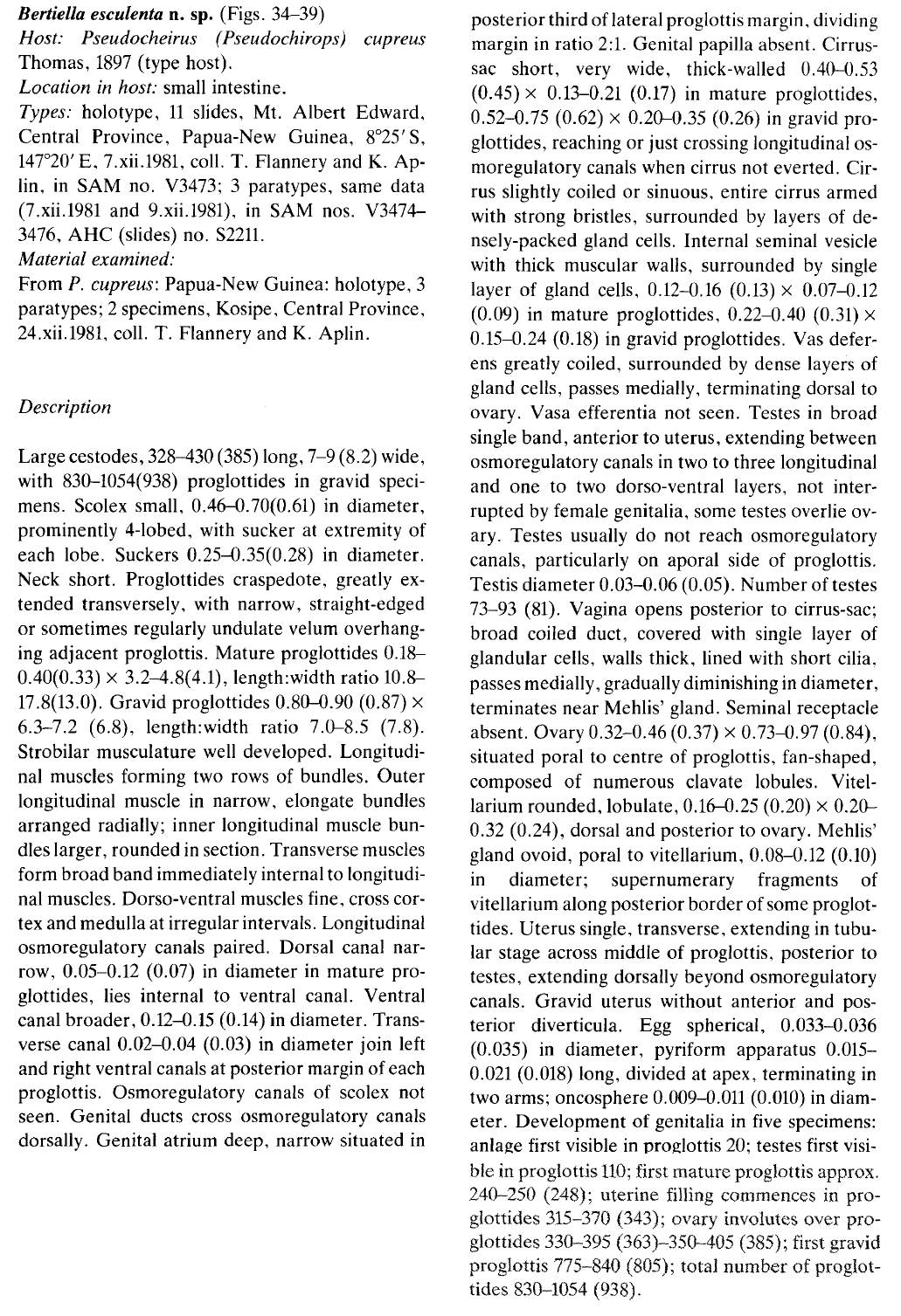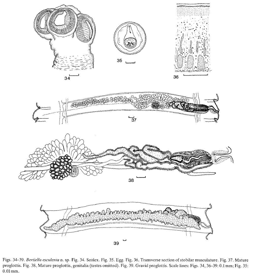 Figs. 34-39, Berlielta esculenta n, sp. Fig, 34. Scolex. Fig. 35. Egg, Fig. 36. Transverse section of stobilar musculature, Fig. 37. Mature