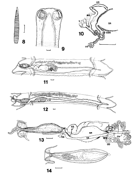 Figs 8-14. Bertiella rauschi n. sp. 8. Whole cestode. 9. Scolex. 10. Transverse section through female genital ducts; dorsal aspect towards top of page. 11. Mature proglottis. 12. Near-gravid proglottis. 13. Section through cirrus sac and vagina. 14. Cirrus-sac, cirrus retracted. Scale-bars: Fig. 8, 10 mm; Figs 9-14, 0.1 mm.