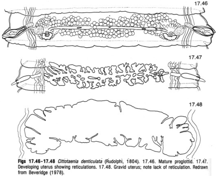 Beveridge, I. 1978. A taxonomic revision of the genera Cittotaenia Riehm, 1881, Ctenotaenia Railliet, 1893, Mosgovoyia Spasskii, 1951 and Pseudocittotaenia Tenora, 1976. (Cestoda: Anoplocephalidae). Mémoires du Muséum National d’Histoire Naturelle 107: 1-64.