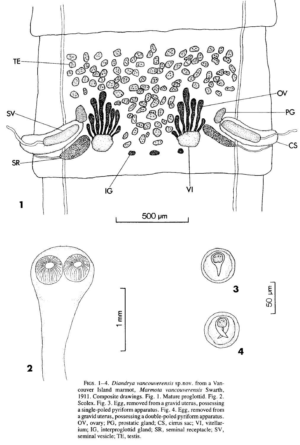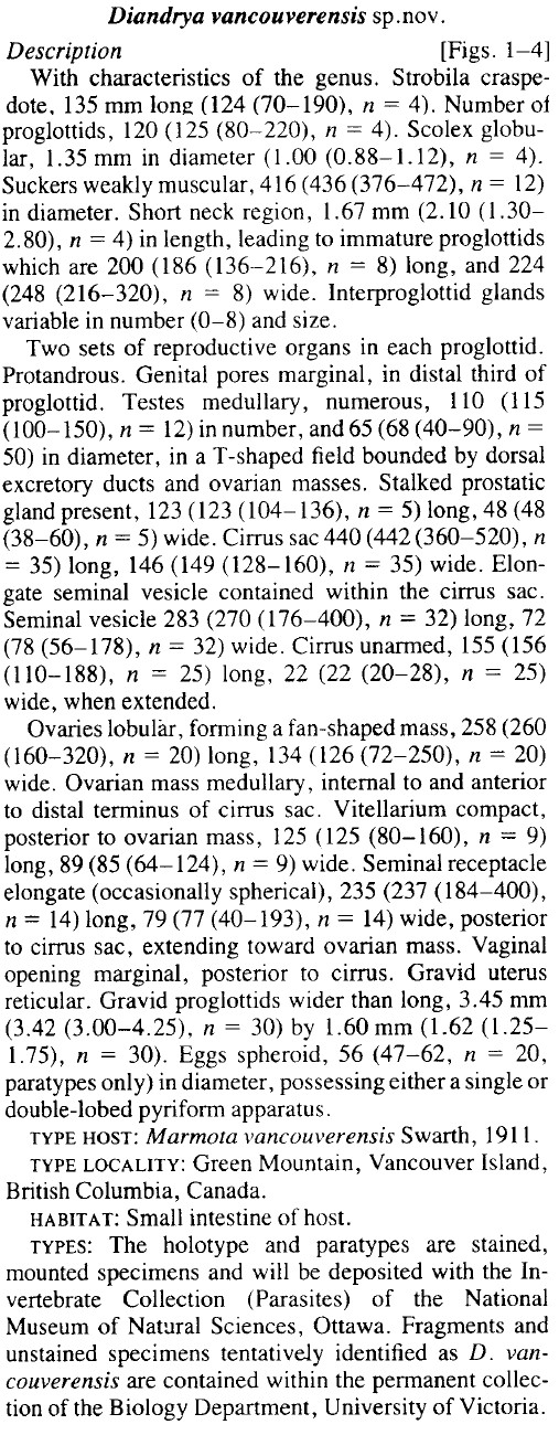 Mace, T. F. and C. D. Shepard. 1981. Helminths of a Vancouver Island marmot, Marmota vancouverensis Swarth, 1911, with a description of Diandrya vancouverensis sp. nov. (Cestoda: Anoplocephalidae). Canadian Journal of Zoology 59: 790-792.