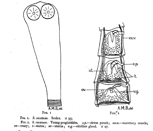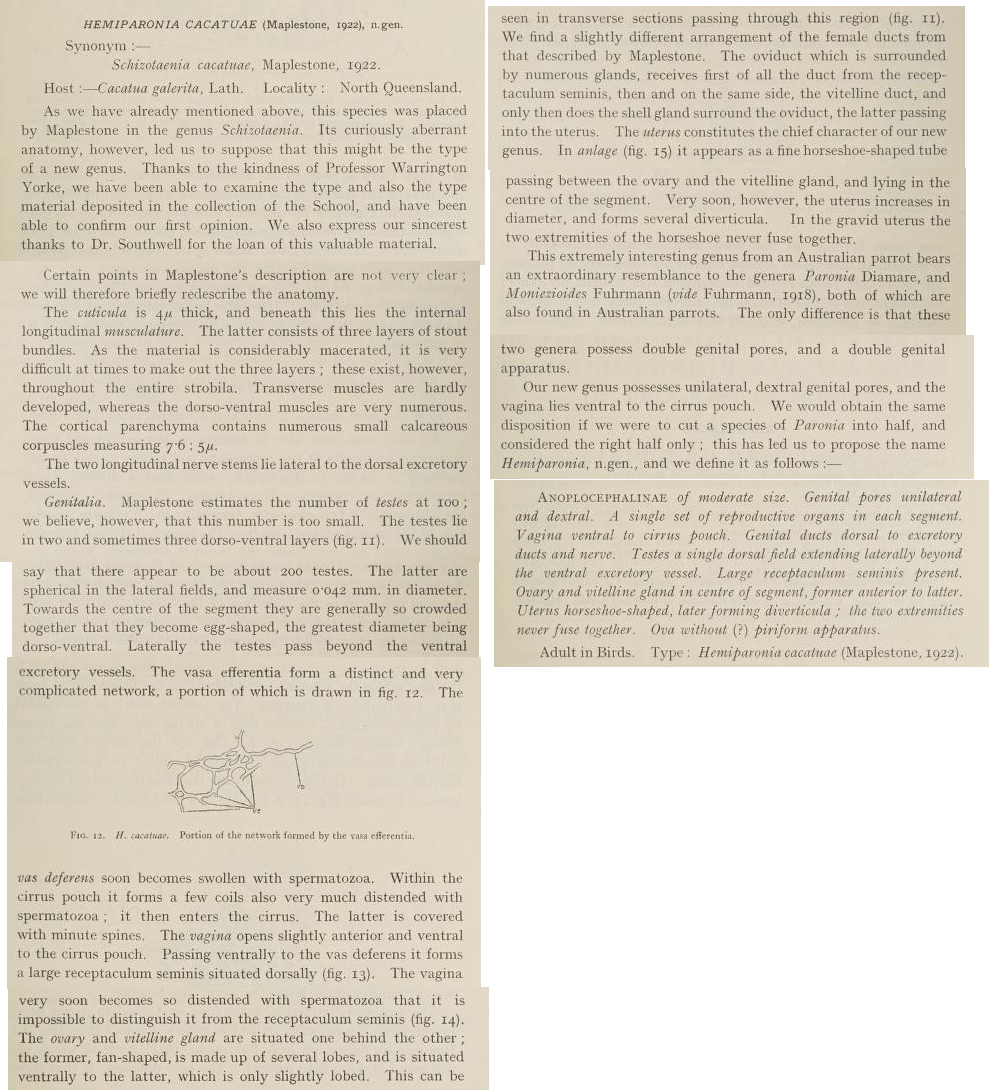 Maplestone, P. A. 1922. Notes on Australian cestodes. VI. Schizotaenia cacatuae. Annals of Tropical Medicine and Parasitology 16 (3): 305-310. (5463) Download PDFBaer, J. G. 1925. Some Cestoda described by Beddard, 1911-1920. Annals of Tropical Medicine and Parasitology 19: 1-21. (5185) Download PDF |