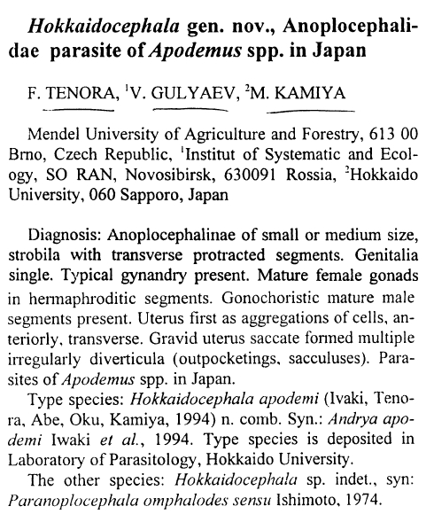 Tenora, F., V. Gulyaev, and M. Kamiya. 1999. Hokkaidocephala gen. nov., Anoplocephalidae parasite of Apodemus spp. in Japan. Helminthologia 36: 130. (4670) Download PDF |