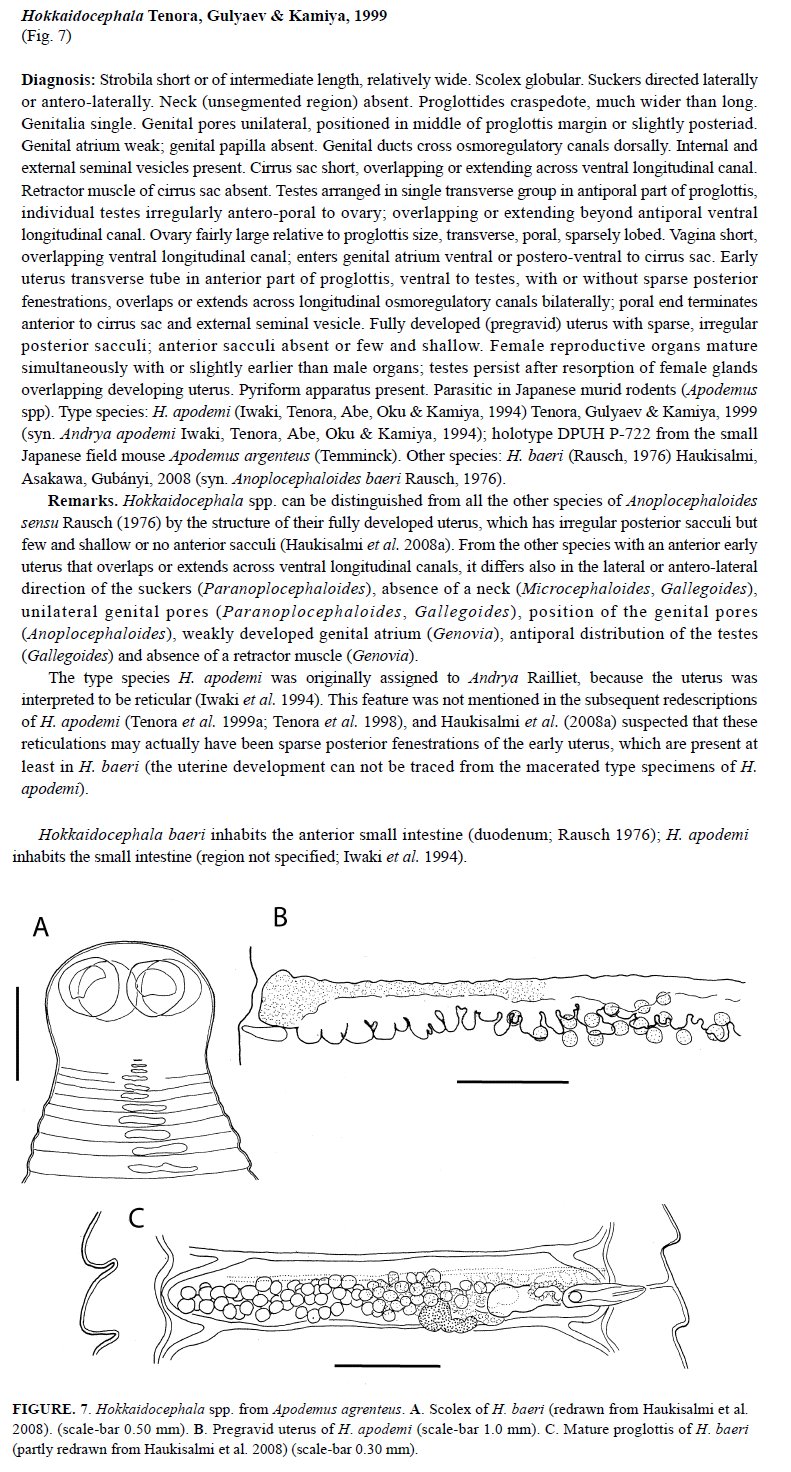 | Type Species | Hokkaidocephala apodemi (Iwaki, Tenora, Abe, Oku & Kamiya, 1994) Tenora, Gulyaev & Kamiya, 1999 |