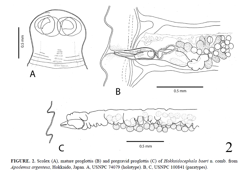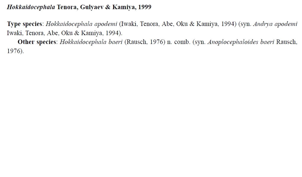 Rausch, R. L. 1976. The genera Paranoplocephala Lühe, 1910 and Anoplocephaloides Baer, 1923 (Cestoda: Anoplocephalidae), with particular reference to species in rodents. Annales de Parasitologie Humaine et Comparée 51: 513-562. (4624) Download PDFHaukisalmi, V., M. Asakawa, and A. Gubányi. 2008. The status of the genus Hokkaidocephala Tenora, Gulyaev & Kamiya, 1999 (Cestoda: Anoplocephalidae), parasites of the endemic Japanese field mice (Apodemus spp.). Zootaxa 1925: 62-68. (4672) Download PDF |
