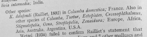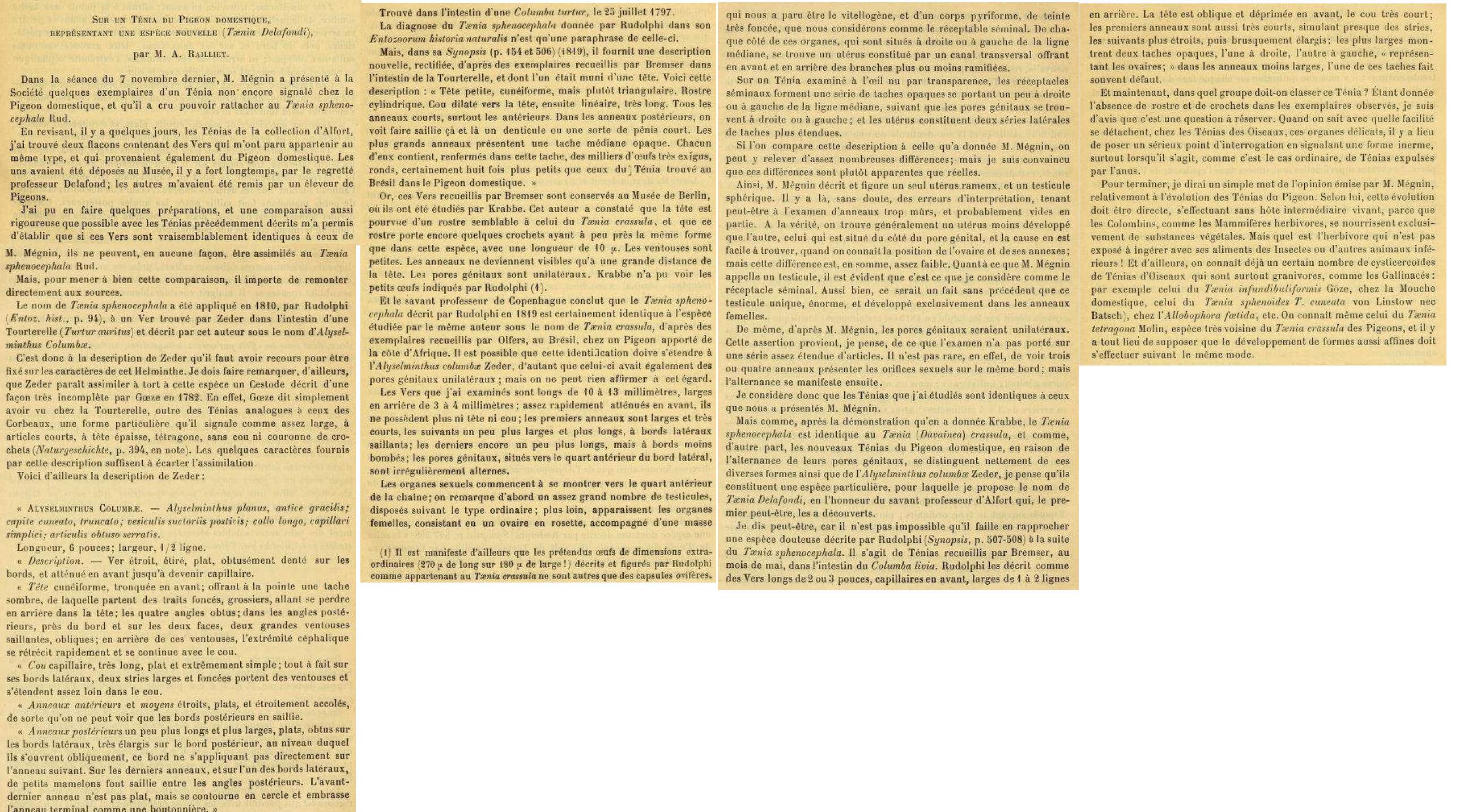 Railliet, M, A. 1892. Sur un Ténia du Pigeon domestique, représentat une espéce nouvelle (Taenia delafondi) . Comptes Rendus Hebdomadaires de Séances er Mémoires de la Société de Biologie 4: 49-53. (4768) Download PDFYamaguti, S. 1959. Systema Helminthum. Vol. II. The Cestodes of Vertebrates. Keigaku Publishing House, Tokyo, 860 pp. (694) Download PDF |