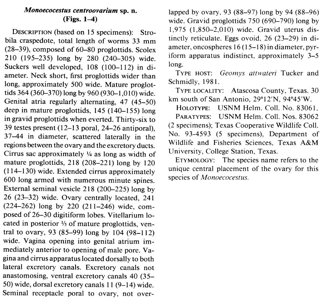 Dronen, N. O., R. M. Pitts, and M. J. Smolen. 1994. Monoecocestus centroovarium sp. n. (Cestoda: Anoplocephalidae) from Attwaters pocket gopher, Geomys attwateri, from the San Antonio area of Texas. Journal of the Helminthological Society of Washington 61: 61-63.