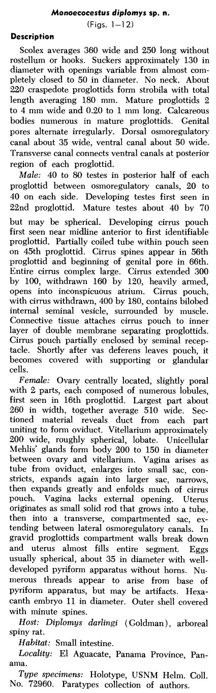 Noble, G. A and R. B. Tesh. 1974. Monoecocestus diplomys sp. n. (Cestoda: Anoplocephalidae) from the rat, Diplomys darlingi. Journal of Parasitology 60: 605-607. (5048) Download PDF |