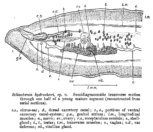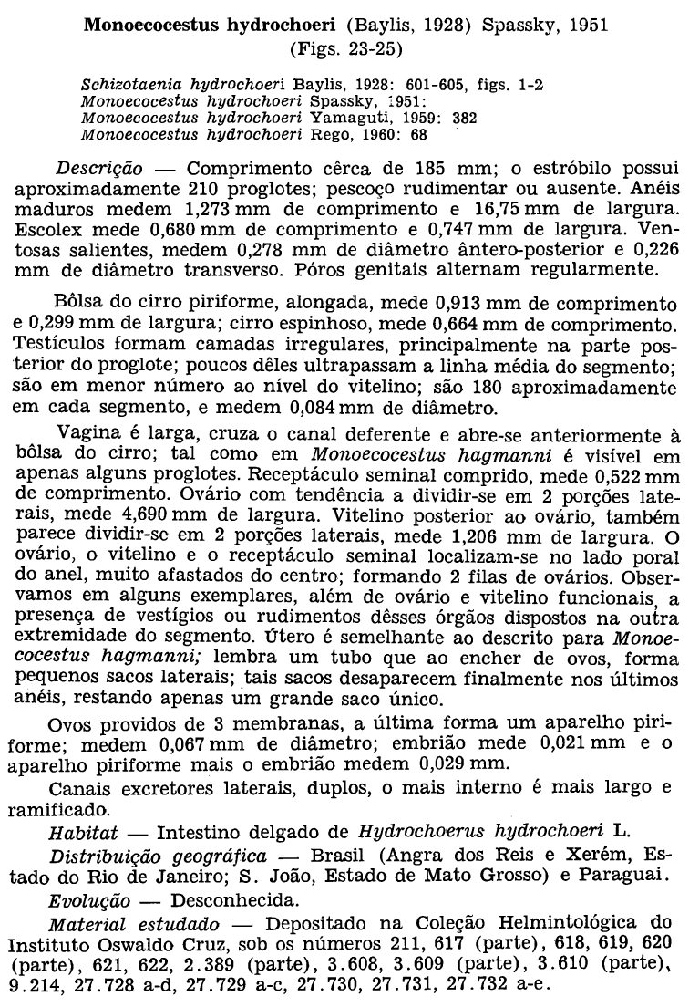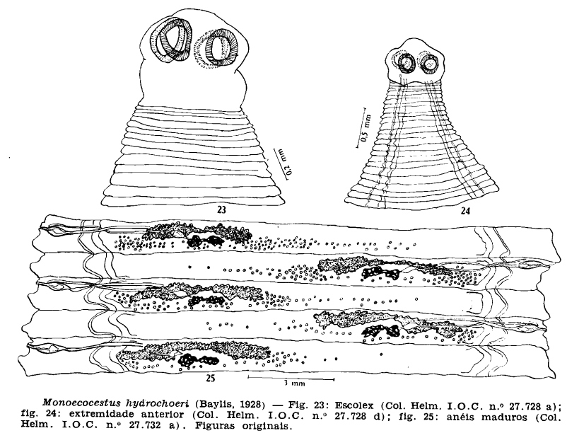 Baylis, H. A. 1928. A new species of Schizotaenia [Cestoda] from the capybara. Annals and Magazine of Natural History (Ser. 10) 1: 601-605. (5190) Download PDFSpasskii, A. A. 1951. Anoplocefalyaty - lentochnye gel'minty domashnyh i dikih zhivotnyh [Anoplocephalate tapeworms of domestic and wild animals]. Osnovy Cestodologii, Vol. 1. K. I. Skrjabin (ed). Izdatel'stvo Akademii Nauk SSSR, Moscow, 735 pp. (2641) Download PDF |