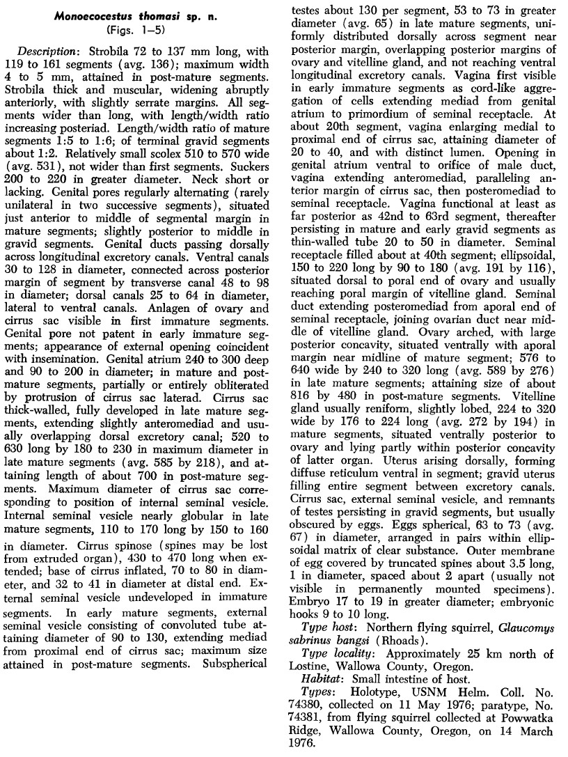 Rausch, R. L. and C. Maser. 1977. Monoecocestus thomasi sp. n. (Cestoda: Anoplocephalidae) from the northern flying squirrel, Glaucomys sabrinus (Shaw), in Oregon. Journal of Parasitology 63: 793-799.