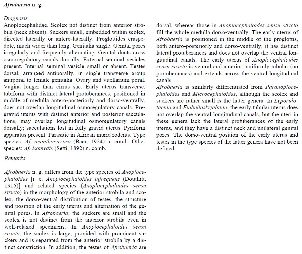 | Type Species | Afrobaeria acanthocirrosa (Baer, 1924) Haukisalmi, 2008, syn. Paranoplocephala acanthocirrosa Baer, |
