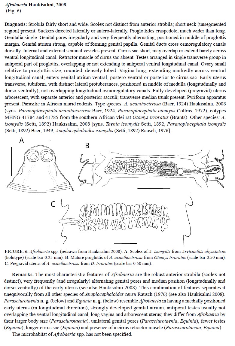 Haukisalmi, V. 2008. Review of Anoplocephaloides species from African rodents, with the proposal of Afrobaeria n. g. (Cestoda: Anoplocephalidae). Helminthologia 45: 57-63. (4589) Download PDF |