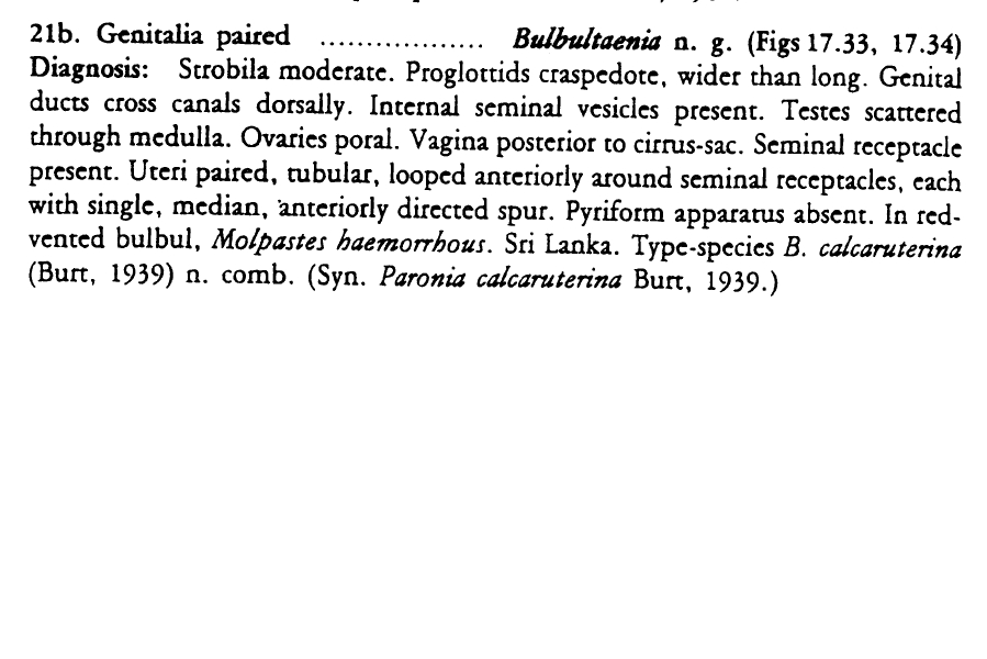 Type Species | Bulbultaenia calcaruterina (Burt, 1939) Beveridge, 1994, syn. Paronia calcaruterina Burt, 1939 |