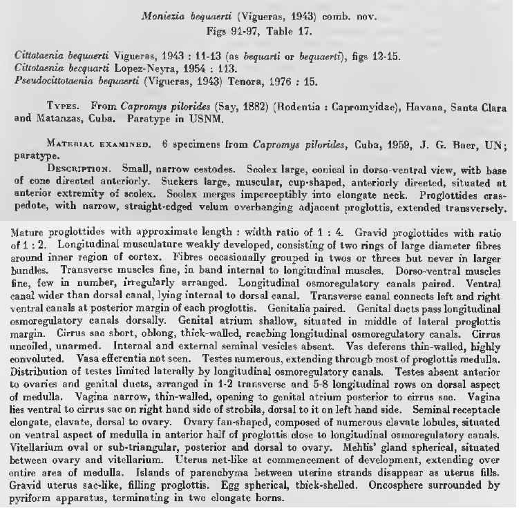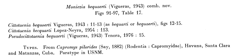 | Synonyms | Cittotaenia bequaerti Vigueras, 1943; Pseudocittotaenia bequaerti (Vigueras, 1943) Tenora, 1976 |