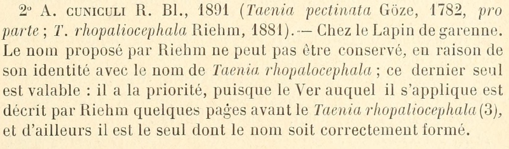 | Synonyms | Taenia rhopaliocephala Riehm, 1881; Andrya cuniculi (Blanchard, 1891) Railliet, 1893; Anoplocephala cuniculi Blanchard, 1891; Moniezia cuniculi (Blanchard, 1891) Blanchard, 1893 |